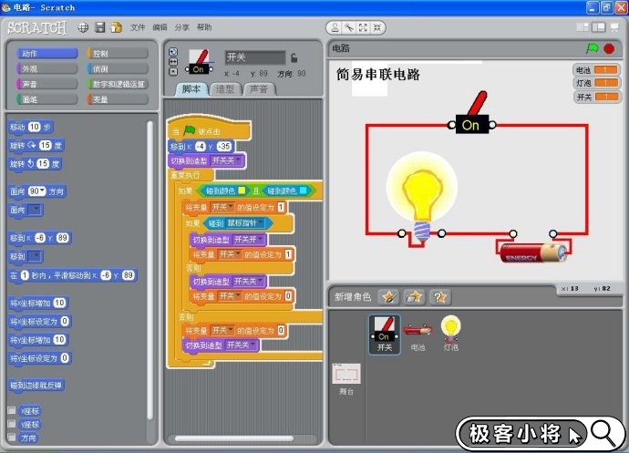 3356我們用一根導線連接干電池的正極、負極與一個小燈泡相連當電流流過燈絲時,燈泡就會發光在科學課上,學生們做過這個實驗。這節課,我們用scratch軟件設計一個點亮小燈泡的電路,好嗎?請看老師開的例子“電路”,瞧!教師使用鼠標拖動組件來連接它們將鼠標移動到交換機上看,燈泡在發光!