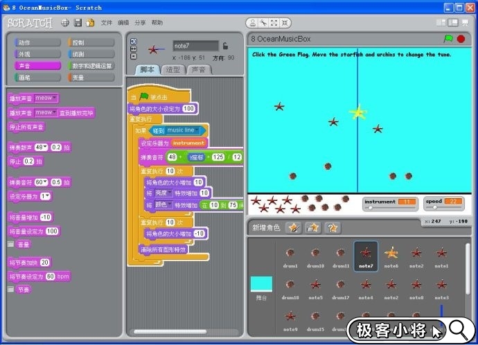 scratch還可以創(chuàng)作出播放各種音樂的作品,并開放范例“Music and dance”中的第8個例子“Ocean music box”海洋音樂盒)讓 讓我們看一看一條移動的直線接觸不同的字符,發(fā)出聲音用鼠標(biāo)改變變量的值哇哦!It 能夠演奏不同的音樂真是太棒了。讓 我們還設(shè)計了一個有趣的音樂盒。