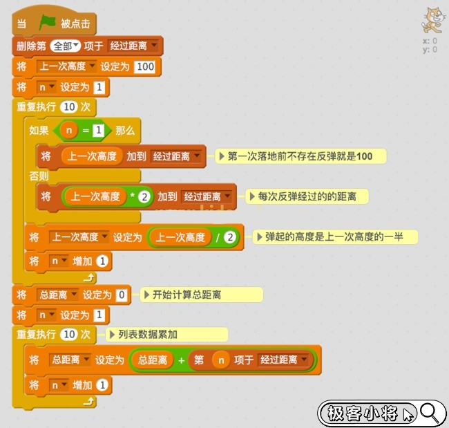 scratch計算彈球問題題目:一球從100米高度自由落下,每次落地后反跳回原高度的一半;再落下,求它在第10次落地時,共經過多少米?第10次反彈多高?分析:第一次:落地反彈高度100/2 落地經過:100第二次:落地反彈高度100/2/2 落地經過:100+100/2*2第三次:落地反彈高度100/
