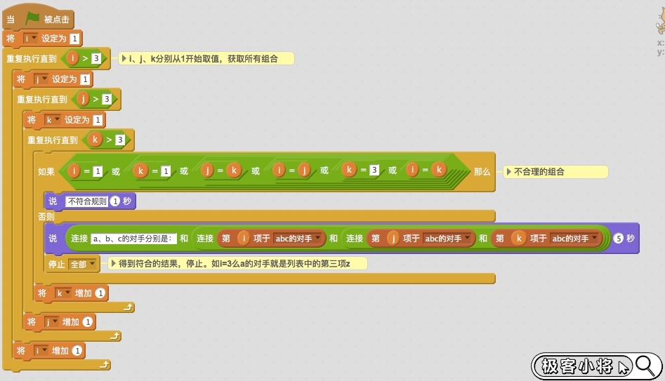 具體方案如下:我們先假設a、b、c的對手分別為i 、j、k ,將x,y,z分別用數字1、2、3代替,這樣就更接近數學的方程問題了。接下來進行各種可能的組合(i、j、k 都可以等于1、2、3),每當得到一組組合結果,進行判斷,如果結果滿足下列條件之一,那么這組結果都是不符合的,否則就是正確的。