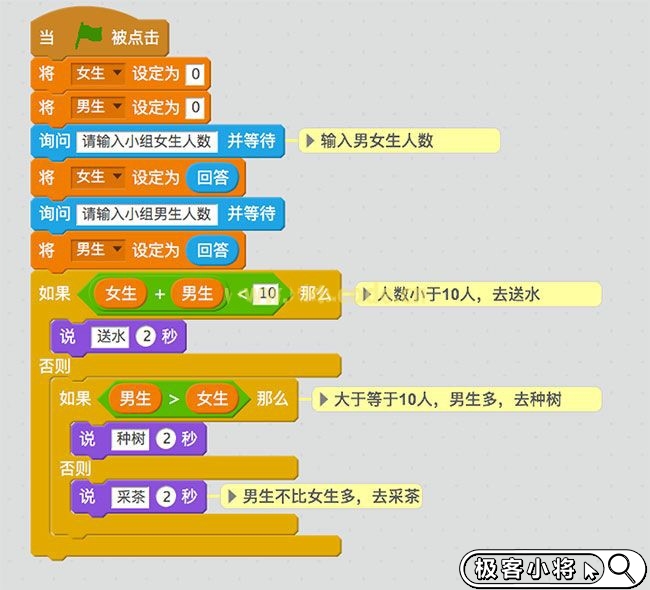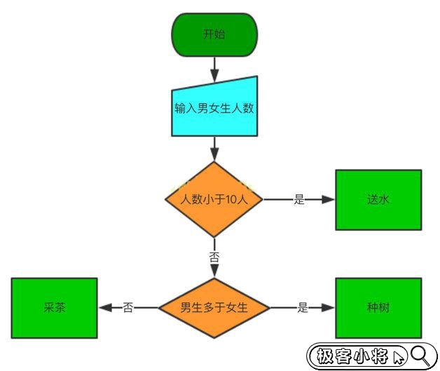 題目出自CCF計算機程序設計入門篇練習(難度:低)題目描述:在社會實踐活動中有三項任務分別是:種樹、采茶、送水。依據(jù)小組人數(shù)及男生、女生人數(shù)決定小組的接受任務,人數(shù)小于10人的小組負責送水(說送水),人數(shù)大于等于10人且男生多于女生的小組負責種樹(說種樹),人數(shù)