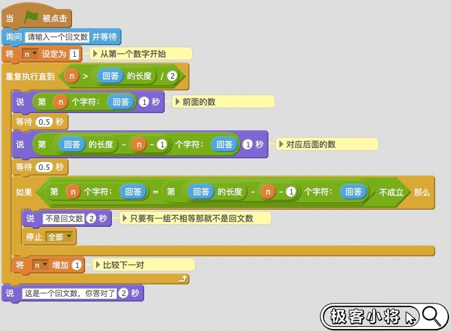 scratch算法練習-檢測回文數回文數的概念:即是給定一個數,這個數順讀和逆讀都是一樣的。例如:121,1221是回文數,123,1231不是回文數。題目:讓用戶輸入任意一個數字,判斷這個數字是否是回文數。思路:第一位和最后一位比較,第二位和倒數第二位比較……比到正中間結束