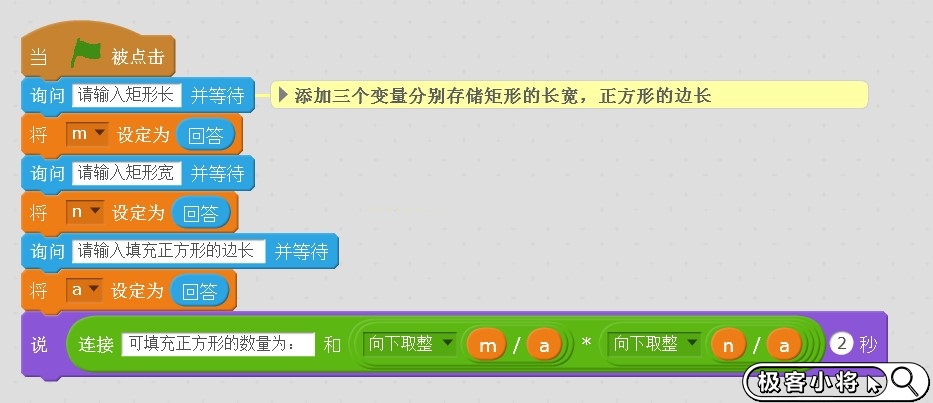 scratch算法練習-矩形填充題目出自CCF計算機程序設計入門篇練習(基本要求能夠理解除法,思路很重要)題目描述已知矩形的大小為nm,現用aa的正方形填充該矩形。輸入三個正整數n,m,a(n,m,a≤10^3),計算至多能填入多少正方形?(正方形可以正好碰到矩形邊界,但不能超出矩形