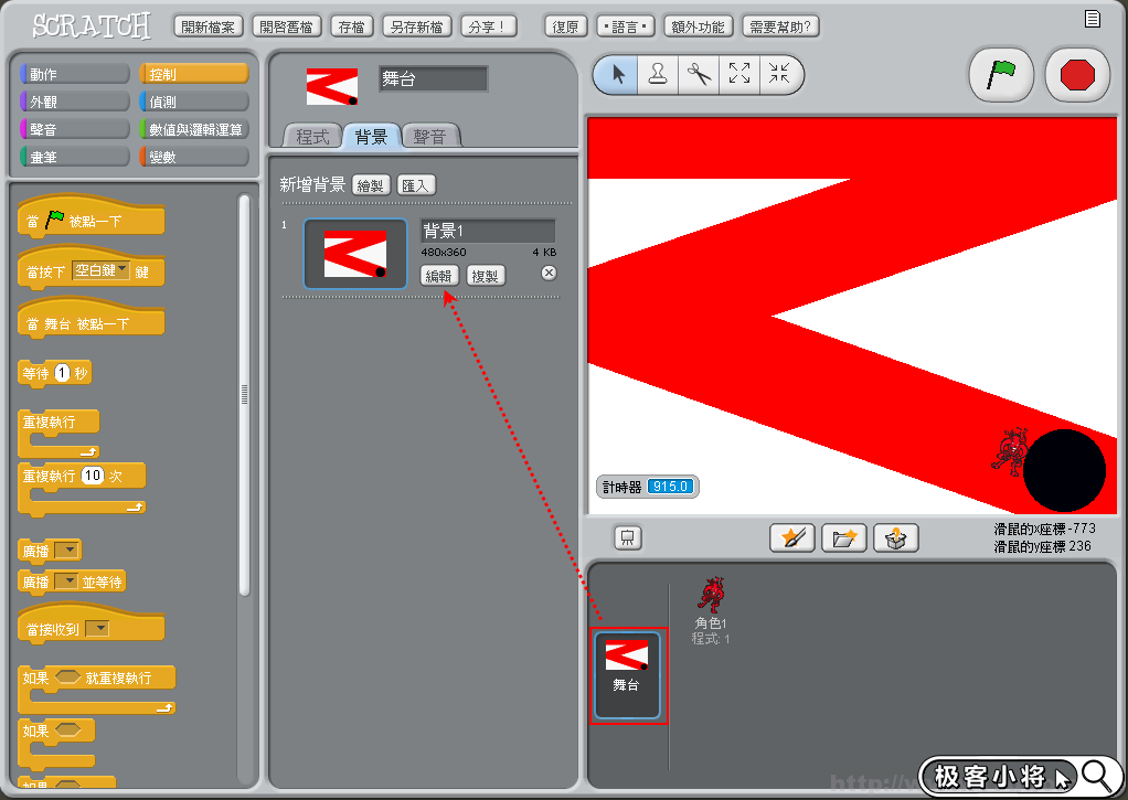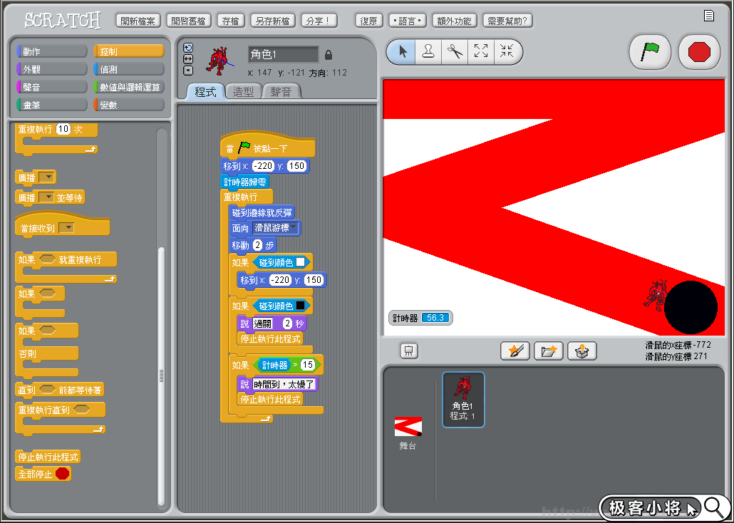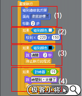 1)角色走下舞臺可能看不到,先從動作命令類拖出來「碰到邊緣就反彈」,接著拖曳「面向.下拉點選「鼠標游標」,即讓角色一直面對鼠標的光標,最后拖動「移動2步」,就是一次移動兩步。