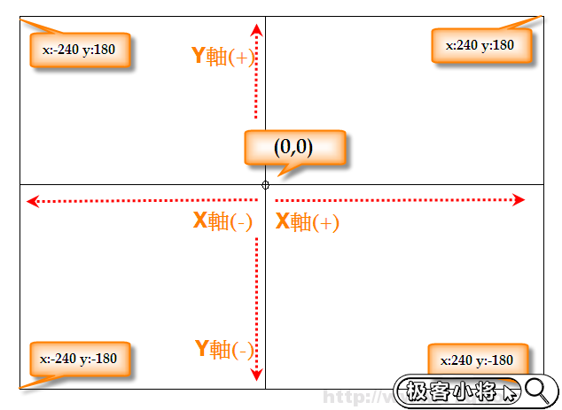 整個舞臺的坐標如下圖中心在中心,左右X軸240,右邊是(+),往左是(,上下y軸各180°,向上是(+),往下是(