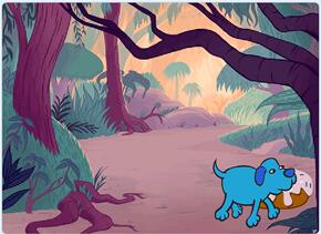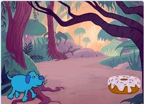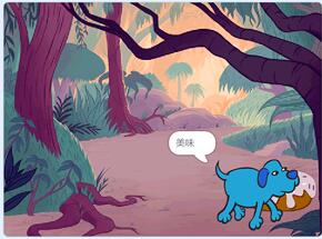 找食物 1.準備工作 (1)添加背景:Jungle; (2)刪除小貓角色,添加角色:Dog2、Donut; 2.功能實現 (1)點擊綠旗,小狗的初始位置在舞臺左下角,面向右;甜甜圈的初始位置在舞臺右下角;(2)等待1秒后,小狗從左下角向右走一段距離,走到甜甜圈