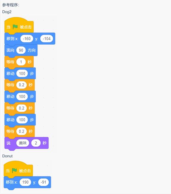 (2)等待1秒后,小狗從左下角向右走一段距離,走到甜甜圈邊上(注意:能看到走動過程,不能瞬間移動到 甜甜圈邊上);