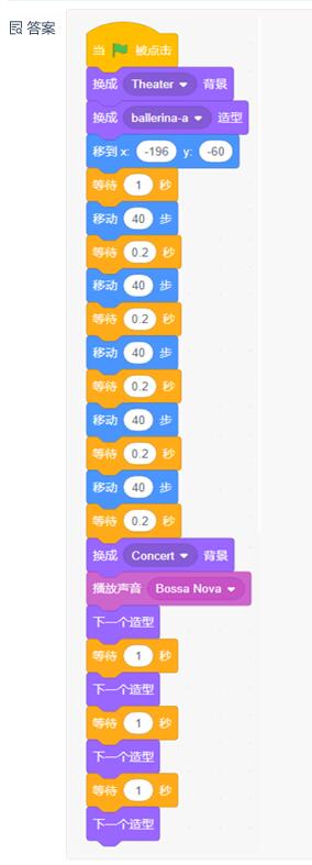 舞蹈演出 1.準備工作 (1)刪除小貓角色; (2)添加角色Ballerina,為角色添加聲音Bossa Nova; (3)添加背景Theater和Concert。 2.功能實現 (1)點擊綠旗,角色Ballerina初始造型為ballerina-a,初始背景為Theater,初始位置在舞臺左側;&
