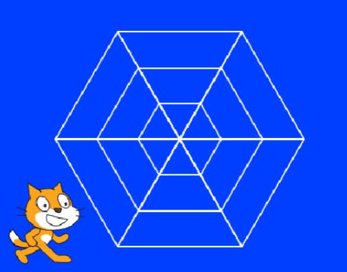 編程實現:設臵舞臺背景為藍色,選擇畫筆為白色,粗細 2,坐標(0,0)點為中心,繪制一 個如圖所示的蜘蛛網。它是三層結構,基本單元中最小的三角形邊長為 50,每向外延 伸一層,邊長增加 50。注意: 1、點擊綠旗,小貓能夠瞬間繪制出蜘蛛網圖案,中間不可停頓。 2