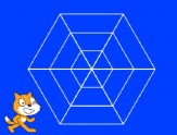編程實(shí)現(xiàn):設(shè)臵舞臺(tái)背景為藍(lán)色,選擇畫(huà)筆為白色,粗細(xì) 2,坐標(biāo)(0,0)點(diǎn)為中心,繪制一 個(gè)如圖所示的蜘蛛網(wǎng)。它是三層結(jié)構(gòu),基本單元中最小的三角形邊長(zhǎng)為 50,每向外延 伸一層,邊長(zhǎng)增加 50。注意: 1、點(diǎn)擊綠旗,小貓能夠瞬間繪制出蜘蛛網(wǎng)圖案,中間不可停頓。 2