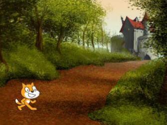編程實(shí)現(xiàn):小貓從坐標(biāo)點(diǎn)(-165,-93)出發(fā)向城堡走去。隨著位臵的移動(dòng),角色大小逐漸變 小,最后在城堡前消失。