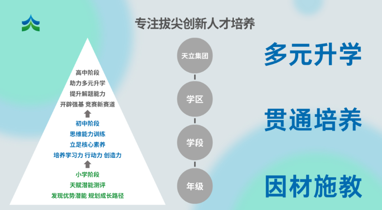 學(xué)校拔尖創(chuàng)新人才培養(yǎng)尊重學(xué)生成長規(guī)律和個體差異,依托集團化辦學(xué)優(yōu)勢,打通小、初、高一體化人才培養(yǎng)壁壘,為各年齡段學(xué)生提供系統(tǒng)學(xué)習(xí)方案,實現(xiàn)涪陵天立學(xué)子全學(xué)段、一體化、貫通式培養(yǎng),助力學(xué)生進入雙一流名校。