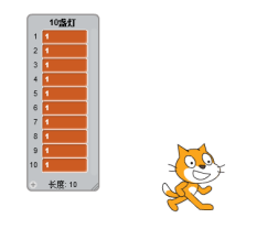 1、建立一個(gè)列表保存燈的狀態(tài),0 代表關(guān),1 代表開。當(dāng)綠旗被點(diǎn)擊,列表添加 10 個(gè)元素,全部為 1。