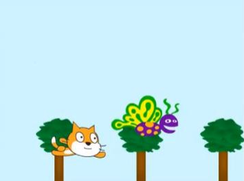編程實現: 1、背景顏色淺藍色,角色:Cat1 Flying、Butterfly1 和 Tree。 2、小貓的初始坐標是(-70,-140),初始化造型為 cat1 flying-b,蝴蝶的初始 坐標是(50,-70),綠樹的角色大小為 60,初始 Y 坐標為-132。 3、小貓和蝴蝶不停地上下輕微移動,并切